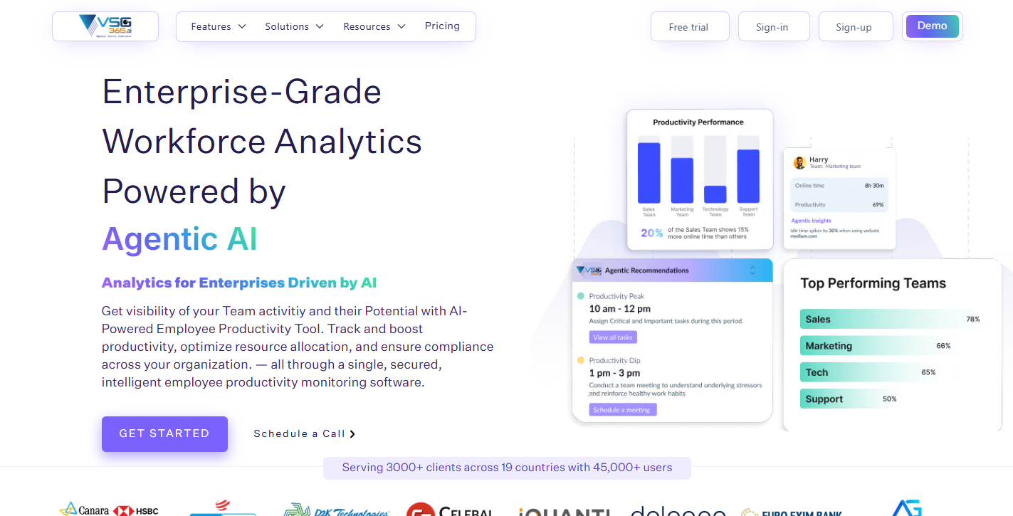 vsg-365.ai is aworkforce analytics and employee monitoring tool designed to enhance employeeproductivity and prevent burnout. It offers location performance, screenrecording, livestream, app and URLs’ classification as productive/unproductive,attendance management, domain blocking, and more. Serving over 5,500 companies and 20,000 users,it offers 99.99% uptime SLA. It is SOC-2, GDPR, ISO, and VAPT compliant, withTLS/SSL and AES-256 encryption for data protection.It runs smoothly on MAC OS 10.11 and above,most Linux OS versions, and Windows 7 or up. Its servers are located in secureenterprise data center facilities with 24/7 monitoring and hosting support. Thesoftware does not monitor anything when employees are on a break or whenthey’re not working.
